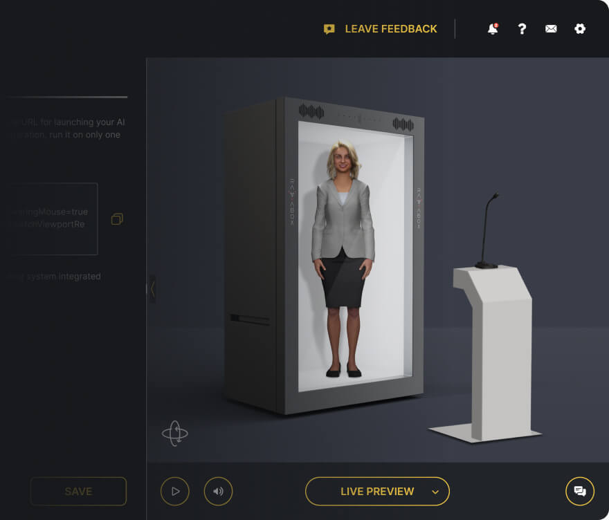 The avatar is now active inside the holobox, responding to input, speaking your content, and engaging your audience live. No manual control or backstage staff required; just a fully autonomous, on-demand holographic presence.